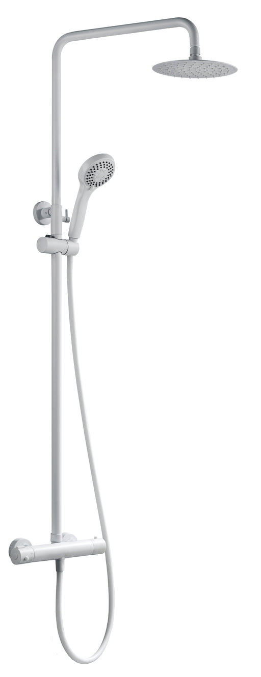 Conjunto de ducha termostático de la serie KENT fabricado por Imex en acabado blanco mate, barra de ducha extensible, cuerpo de la griferia de lató...
